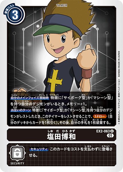 【自分のメインフェイズ開始時】特徴に「サイボーグ型」か「マシーン型」を持つ自分のデジモンがいるとき、メモリー+1。【お互いのターン】特徴に「サイボーグ型」か「マシーン型」を持つ自分のデジモンがレストしたとき、このテイマーをレストさせることで、≪1ドロー≫(自分のデッキからカードを1枚引く)。その後、自分の手札を1枚破棄する。