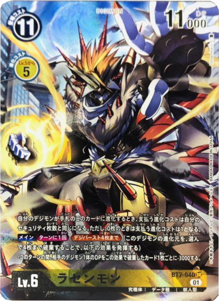 自分のデジモンが手札のこのカードに進化するとき、支払う進化コストは自分のセキュリティ枚数と同じになる。ただし、0枚のときは支払う進化コストは1となる。【メイン】[ターンに1回]≪デジバースト4枚まで≫(このデジモンの進化元を、選んで4枚まで破棄することで、以下の効果を発揮する)・このターンの間、相手のデジモン1体のDPをこの効果で破棄したカード1枚ごとに-3000する。