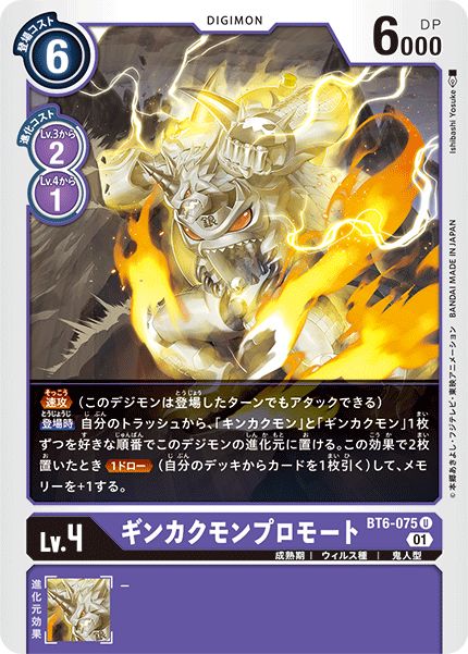 ≪速攻≫(このデジモンは登場したターンでもアタックできる)【登場時】自分のトラッシュから、「キンカクモン」と「ギンカクモン」1枚ずつを好きな順番でこのデジモンの進化元に置ける。この効果で2枚置いたとき≪1ドロー≫(自分のデッキからカードを1枚引く)して、メモリーを+1する。