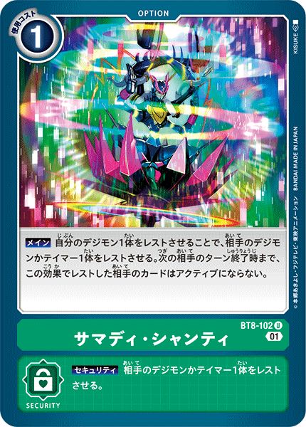 【メイン】自分のデジモン1体をレストさせることで、相手のデジモンかテイマー1体をレストさせる。次の相手のターン終了時まで、この効果でレストした相手のカードはアクティブにならない。