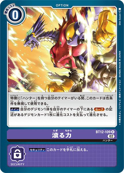 特徴に「ハンター」を持つ自分のテイマーがいる間、このカードは色条件を無視して使用できる。【メイン】自分のデジモン1体を自分のテイマーの下にある≪セーブ≫の記述があるデジモンカード1枚に進化コストを支払って進化させる。