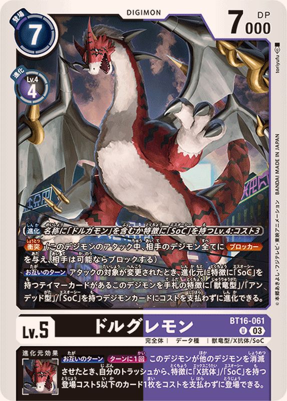 名称に「ドルガモン」を含むか特徴に「SoC」を持つLv.4:コスト3≪衝突≫(このデジモンのアタック中、相手のデジモン全てに≪ブロッカー≫を与え、相手は可能ならブロックする)【お互いのターン】アタックの対象が変更されたとき、進化元に特徴に「SoC」を持つテイマーカードがあるこのデジモンを手札の特徴に「獣竜型」/「アンデッド型」/「SoC」を持つデジモンカードにコストを支払わずに進化できる。