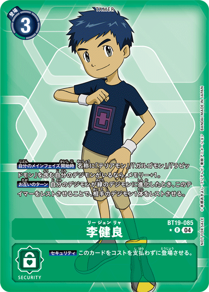 【自分のメインフェイズ開始時】名称に「テリアモン」/「ガルゴモン」/「ラピッドモン」を含む自分のデジモンがいるなら、メモリー+1。【お互いのターン】自分のデジモンが緑のデジモンに進化したとき、このテイマーをレストさせることで、相手のデジモン1体をレストさせる。