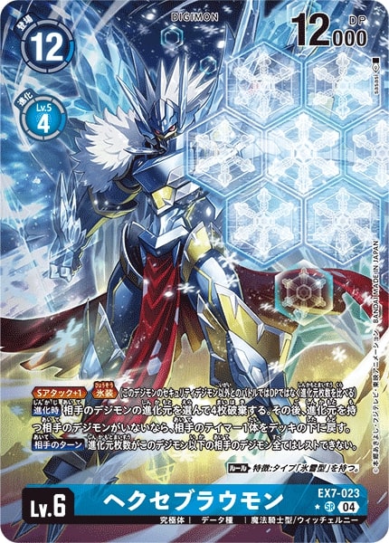 ≪Sアタック+1≫≪氷装≫(このデジモンのセキュリティデジモン以外とのバトルではDPではなく進化元枚数を比べる)【進化時】相手のデジモンの進化元を選んで4枚破棄する。その後、進化元を持つ相手のデジモンがいないなら、相手のテイマー1体をデッキの下に戻す。【相手のターン】進化元枚数がこのデジモン以下の相手のデジモン全てはレストできない。〈ルール〉特徴:タイプ「氷雪型」を持つ。