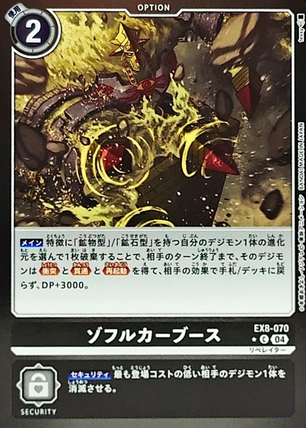 【メイン】特徴に「鉱物型」/「鉱石型」を持つ自分のデジモン1体の進化元を選んで1枚破棄することで、相手のターン終了まで、そのデジモンは≪衝突≫と≪貫通≫と≪再起動≫を得て、相手の効果で手札/デッキに戻らず、DP+3000。