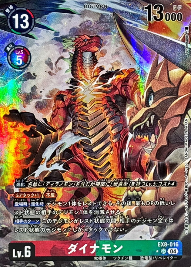 名称に「ティラノモン」を含むか特徴に「恐竜型」を持つLv.5:コスト4≪Sアタック+1≫≪不屈≫【登場時】【進化時】デジモン1体をレストできる。その後、最もDPの低いレスト状態の相手のデジモン1体を消滅させる。【相手のターン】このデジモンがレスト状態の間、相手のデジモン全てはレスト状態のデジモンにしかアタックできない。