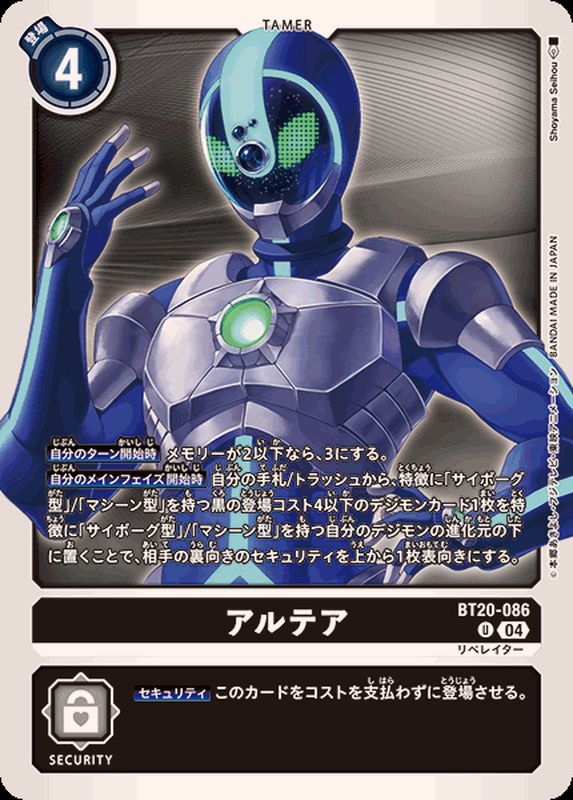 【自分のターン開始時】メモリーが2以下なら、3にする。【自分のメインフェイズ開始時】自分の手札/トラッシュから、特徴に「サイボーグ型」/「マシーン型」を持つ黒の登場コスト4以下のデジモンカード1枚を特徴に「サイボーグ型」/「マシーン型」を持つ自分のデジモンの進化元の下に置くことで、相手の裏向きのセキュリティを上から1枚表向きにする。