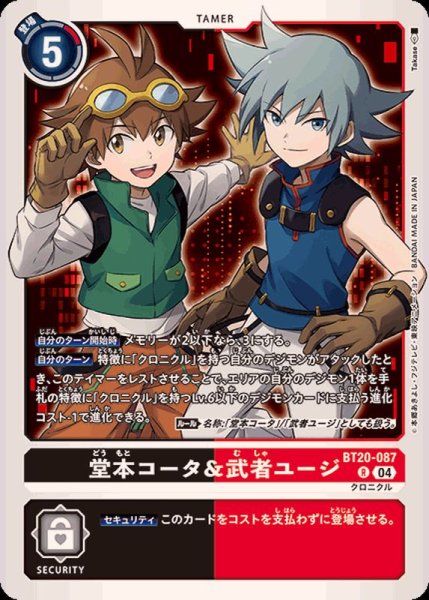 【自分のターン開始時】メモリーが2以下なら、3にする。【自分のターン】特徴に「クロニクル」を持つ自分のデジモンがアタックしたとき、このテイマーをレストさせることで、エリアの自分のデジモン1体を手札の特徴に「クロニクル」を持つLv.6以下のデジモンカードに支払う進化コスト-1で進化できる。〈ルール〉名称:「堂本コータ」/「武者ユージ」としても扱う。