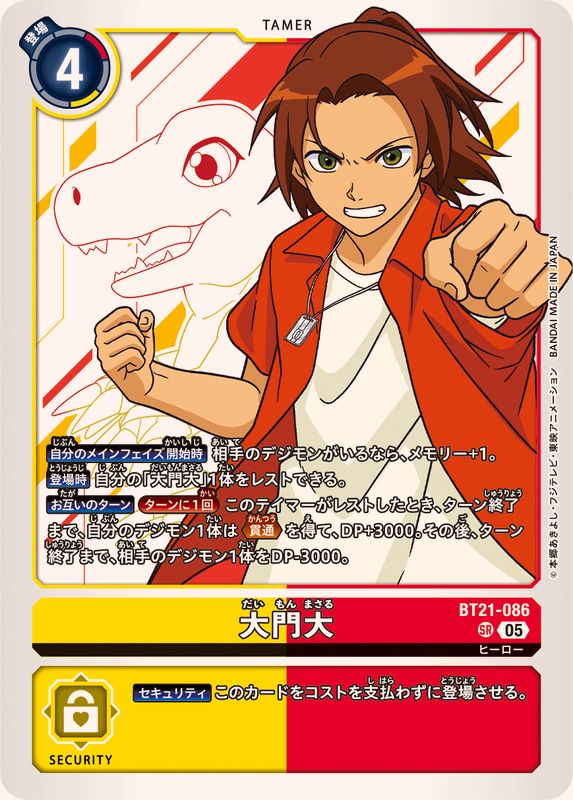 【自分のメインフェイズ開始時】相手のデジモンがいるなら、メモリー+1。【登場時】自分の「大門大」1体をレストできる。【お互いのターン】[ターンに1回]このテイマーがレストしたとき、ターン終了まで、自分のデジモン1体は≪貫通≫を得て、DP+3000。その後、ターン終了まで、相手のデジモン1体をDP-3000。【セキュリティ】このカードをコストを支払わずに登場させる。