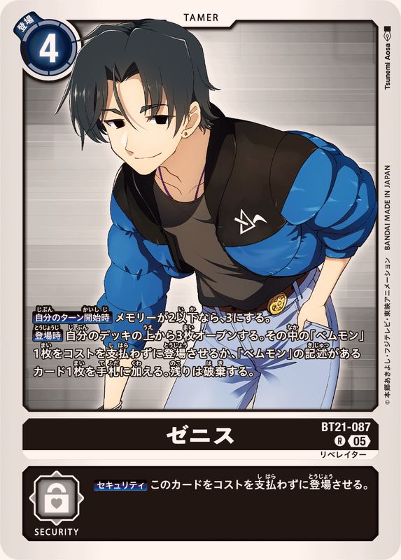 【自分のターン開始時】メモリーが2以下なら、3にする。【登場時】自分のデッキの上から3枚オープンする。その中の「ベムモン」1枚をコストを支払わずに登場させるか、「ベムモン」の記述があるカード1枚を手札に加える。残りは破棄する。【セキュリティ】このカードをコストを支払わずに登場させる。