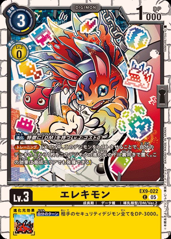 〔進化〕特徴に「DM」を持つLv.2:コスト0≪トレーニング≫(メイン中、このデジモンをレストさせることで、自分のデッキの上から1枚をこのデジモンの進化元の下に裏向きで置く。この効果は育成エリアでも発揮できる)【自分のターン】相手のセキュリティデジモン全てをDP-3000。
