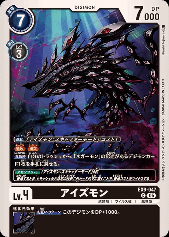 〔進化〕「アイズモン:スキャッターモード」:コスト1≪速攻≫≪衝突≫【消滅時】自分のトラッシュから、「ネガーモン」の記述があるデジモンカード1枚を手札に戻せる。アセンブリ-3:「アイズモン:スキャッターモード」4枚登場するとき、トラッシュから指定の枚数このカードの下に置くことで、登場コストをマイナスする【お互いのターン】このデジモンをDP+1000。