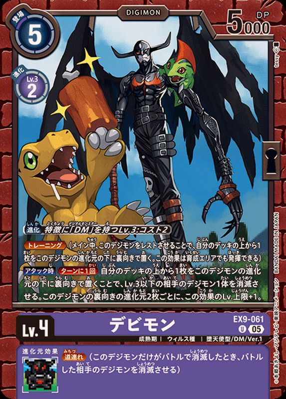 〔進化〕特徴に「DM」を持つLv.3:コスト2≪トレーニング≫(メイン中、このデジモンをレストさせることで、自分のデッキの上から1枚をこのデジモンの進化元の下に裏向きで置く。この効果は育成エリアでも発揮できる)【アタック時】[ターンに1回]自分のデッキの上から1枚をこのデジモンの進化元の下に裏向きで置くことで、Lv.3以下の相手のデジモン1体を消滅させる。このデジモンの裏向きの進化元2枚ごとに、この効果のLv.上限+1。≪道連れ≫(このデジモンだけがバトルで消滅したとき、バトルした相手のデジモンを消滅させる)