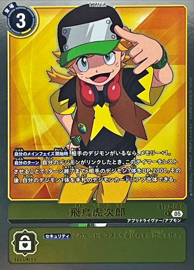 【自分のメインフェイズ開始時】相手のデジモンがいるなら、メモリー+1。【自分のターン】自分のデジモンがリンクしたとき、このテイマーをレストさせることで、ターン終了まで、相手のデジモン1体をDP-2000。その後、自分のデジモン1体を手札のデジモンカードにアプ合体できる。【セキュリティ】このカードをコストを支払わずに登場させる。