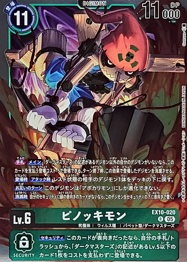 {手札}【メイン】「ダークマスターズ」の記述があるデジモン以外の自分のデジモンがいないなら、このカードを支払う登場コスト-5で登場できる。ターン終了時、この効果で登場したデジモンを消滅させる。【登場時】【アタック時】レスト状態の相手のデジモン1体をデッキの下に戻す。【お互いのターン】このデジモンは「アポカリモン」にしか進化できない。【消滅時】自分のセキュリティに緑の表向きのカードがないなら、このデジモンをセキュリティの下に表向きで置く。【セキュリティ】このカードが表向きだったなら、自分の手札/トラッシュから、「ダークマスターズ」の記述があるLv.5以下のカード1枚をコストを支払わずに登場できる。