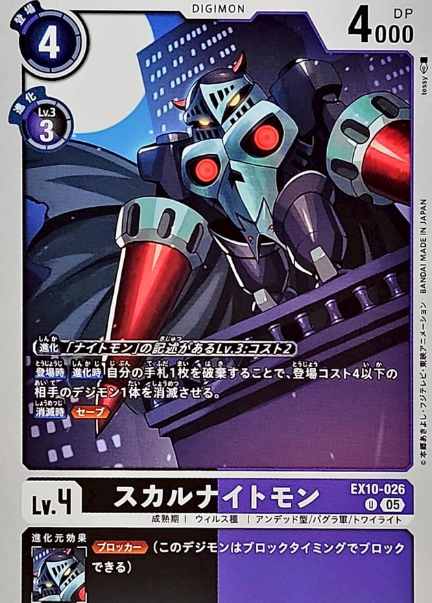 〔進化〕「ナイトモン」の記述があるLv.3:コスト2【登場時】【進化時】自分の手札1枚を破棄することで、登場コスト4以下の相手のデジモン1体を消滅させる。【消滅時】≪セーブ≫≪ブロッカー≫(このデジモンはブロックタイミングでブロックできる)