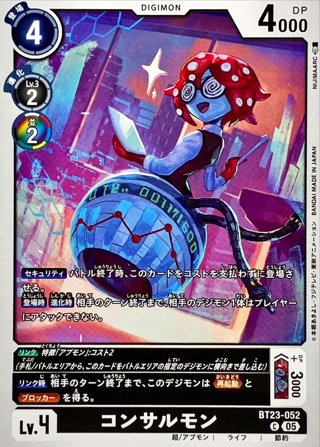 【セキュリティ】バトル終了時、このカードをコストを支払わずに登場させる。【登場時】【進化時】相手のターン終了まで、相手のデジモン1体はプレイヤーにアタックできない。DP+3000〈リンク〉特徴「アプモン」:コスト2(手札/バトルエリアから、このカードをバトルエリアの指定のデジモンに横向きで差し込む)【リンク時】相手のターン終了まで、このデジモンは≪再起動≫と≪ブロッカー≫を得る。