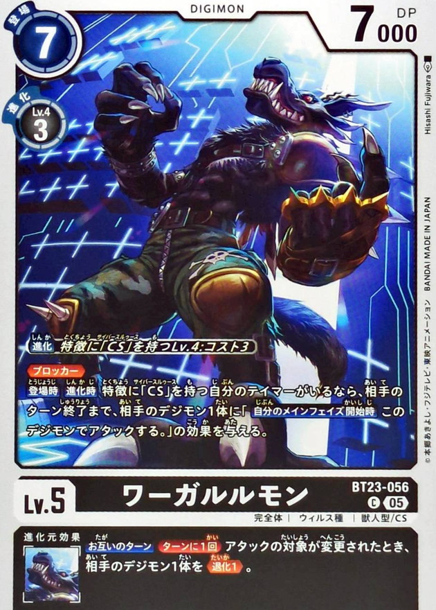 〔進化〕特徴に「CS」を持つLv.4:コスト3≪ブロッカー≫【登場時】【進化時】特徴に「CS」を持つ自分のテイマーがいるなら、相手のターン終了まで、相手のデジモン1体に「【自分のメインフェイズ開始時】このデジモンでアタックする。」の効果を与える。【お互いのターン】[ターンに1回]アタックの対象が変更されたとき、相手のデジモン1体を≪退化1≫。