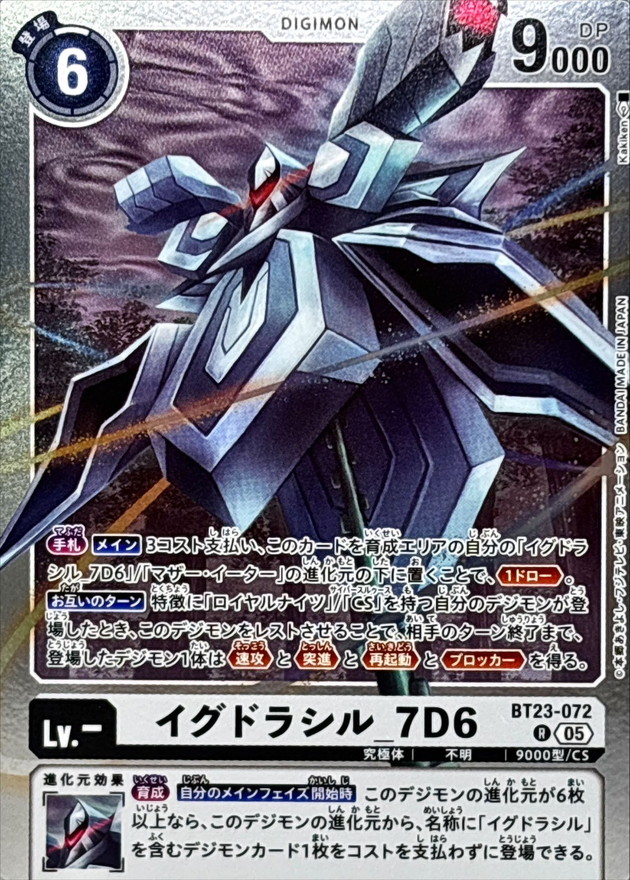 {手札}【メイン】3コスト支払い、このカードを育成エリアの自分の「イグドラシル_7D6」/「マザー・イーター」の進化元の下に置くことで、≪1ドロー≫。【お互いのターン】特徴に「ロイヤルナイツ」/「CS」を持つ自分のデジモンが登場したとき、このデジモンをレストさせることで、相手のターン終了まで、登場したデジモン1体は≪速攻≫と≪突進≫と≪再起動≫と≪ブロッカー≫を得る。{育成}【自分のメインフェイズ開始時】このデジモンの進化元が6枚以上なら、このデジモンの進化元から、名称に「イグドラシル」を含むデジモンカード1枚をコストを支払わずに登場できる。