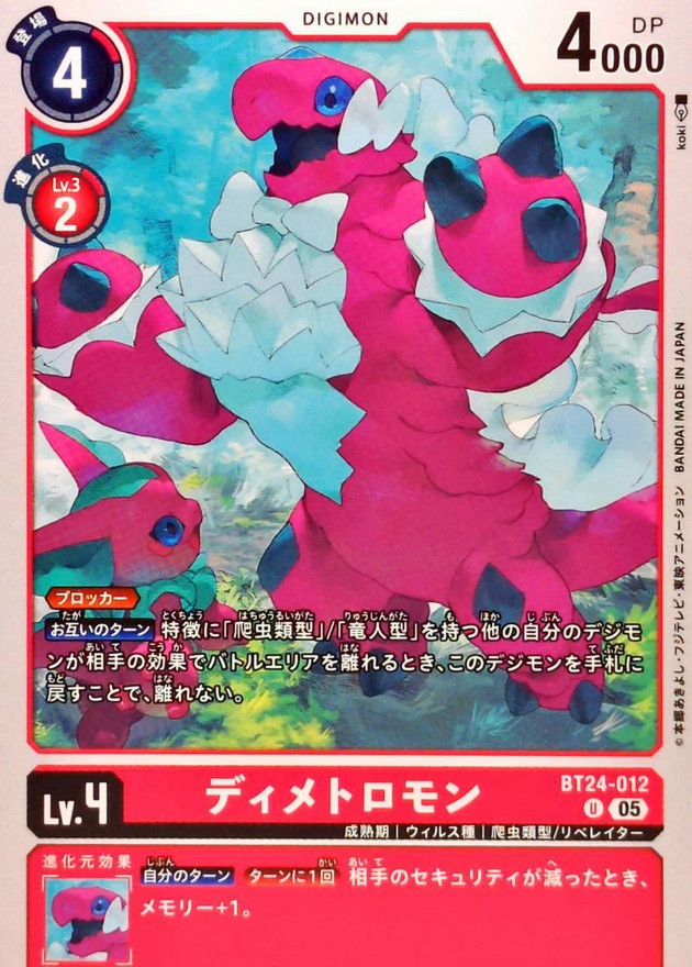 ≪ブロッカー≫【お互いのターン】特徴に「爬虫類型」/「竜人型」を持つ他の自分のデジモンが相手の効果でバトルエリアを離れるとき、このデジモンを手札に戻すことで、離れない。【自分のターン】[ターンに1回]相手のセキュリティが減ったとき、メモリー+1。