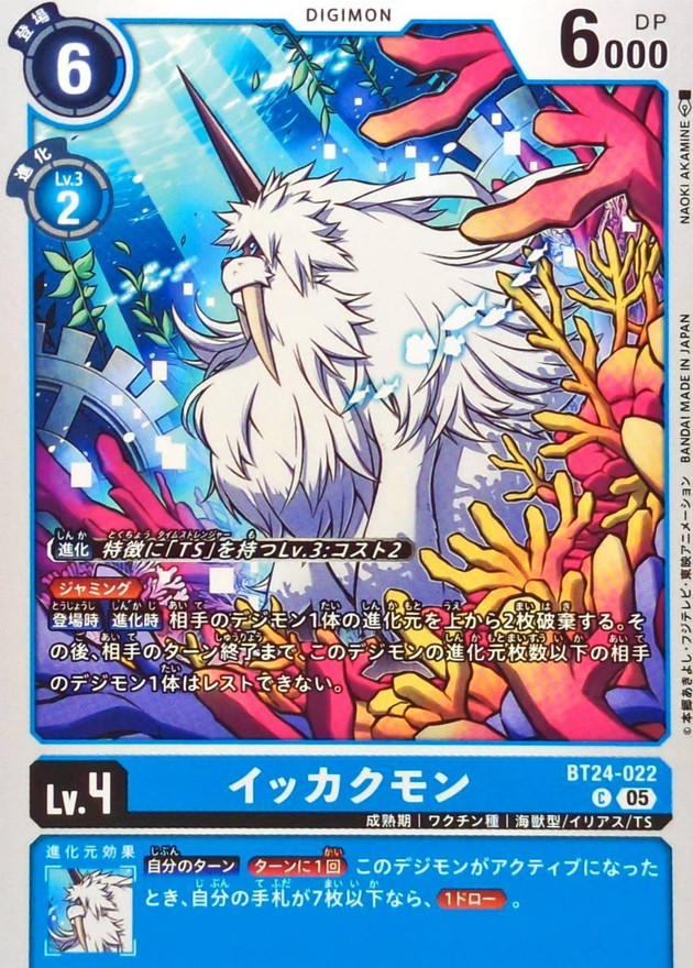 〔進化〕特徴に「TS」を持つLv.3:コスト2≪ジャミング≫【登場時】【進化時】相手のデジモン1体の進化元を上から2枚破棄する。その後、相手のターン終了まで、このデジモンの進化元枚数以下の相手のデジモン1体はレストできない。【自分のターン】[ターンに1回]このデジモンがアクティブになったとき、自分の手札が7枚以下なら、≪1ドロー≫。