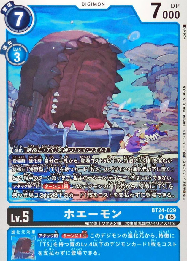 〔進化〕特徴に「TS」を持つLv.4:コスト3【登場時】【進化時】自分の手札から、登場コスト5以下の、特徴に「水棲」を含むか特徴に「海獣型」/「TS」を持つカード1枚をこのデジモンの進化元の下に置くことで、相手のターン終了まで、相手のデジモン/テイマー1体はレストできない。【アタック終了時】[ターンに1回]このデジモンの進化元から、特徴に「TS」を持つ登場コスト5以下のカード1枚をコストを支払わずに登場できる。【アタック時】[ターンに1回]このデジモンの進化元から、特徴に「TS」を持つ青のLv.4以下のデジモンカード1枚をコストを支払わずに登場できる。