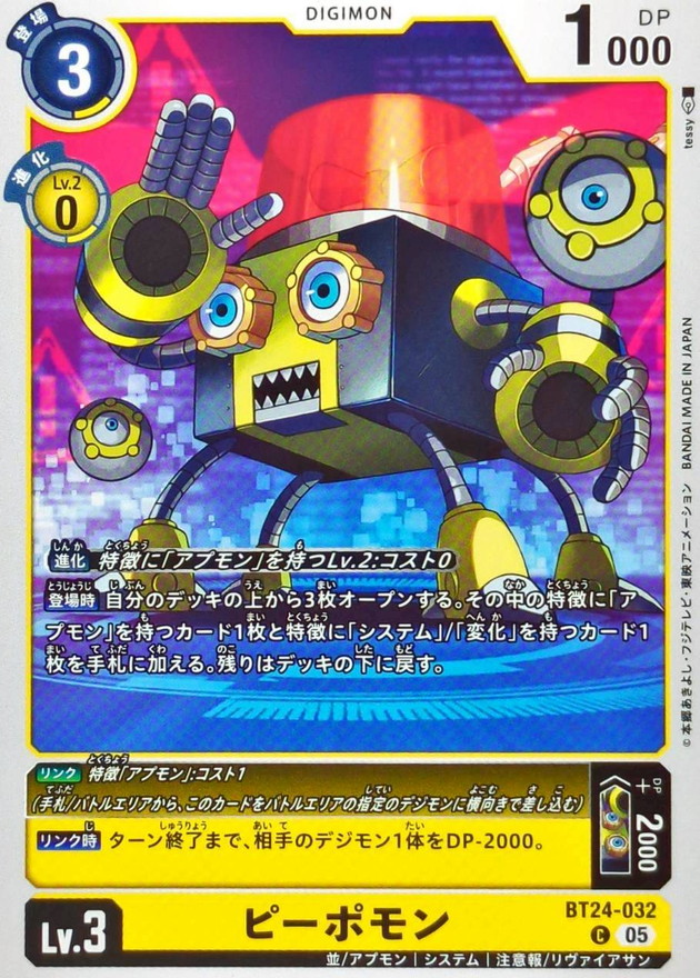 〔進化〕特徴に「アプモン」を持つLv.2:コスト0【登場時】自分のデッキの上から3枚オープンする。その中の特徴に「アプモン」を持つカード1枚と特徴に「システム」/「変化」を持つカード1枚を手札に加える。残りはデッキの下に戻す。DP+2000〈リンク〉特徴「アプモン」:コスト1(手札/バトルエリアから、このカードをバトルエリアの指定のデジモンに横向きで差し込む)【リンク時】ターン終了まで、相手のデジモン1体をDP-2000。