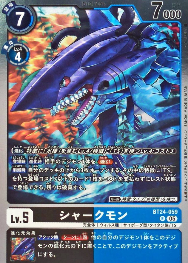 〔進化〕特徴に「水棲」を含むLv.4/特徴に「TS」を持つLv.4:コスト3【登場時】【進化時】相手のデジモン1体を≪退化1≫。【消滅時】自分のデッキの上から3枚オープンする。その中の特徴に「TS」を持つ登場コスト7以下のカード1枚をコストを支払わずにレスト状態で登場できる。残りは破棄する。〈ルール〉特徴:タイプ「水棲型」を持つ。【アタック時】[ターンに1回]他の自分のデジモン1体をこのデジモンの進化元の下に置くことで、このデジモンをアクティブにする。