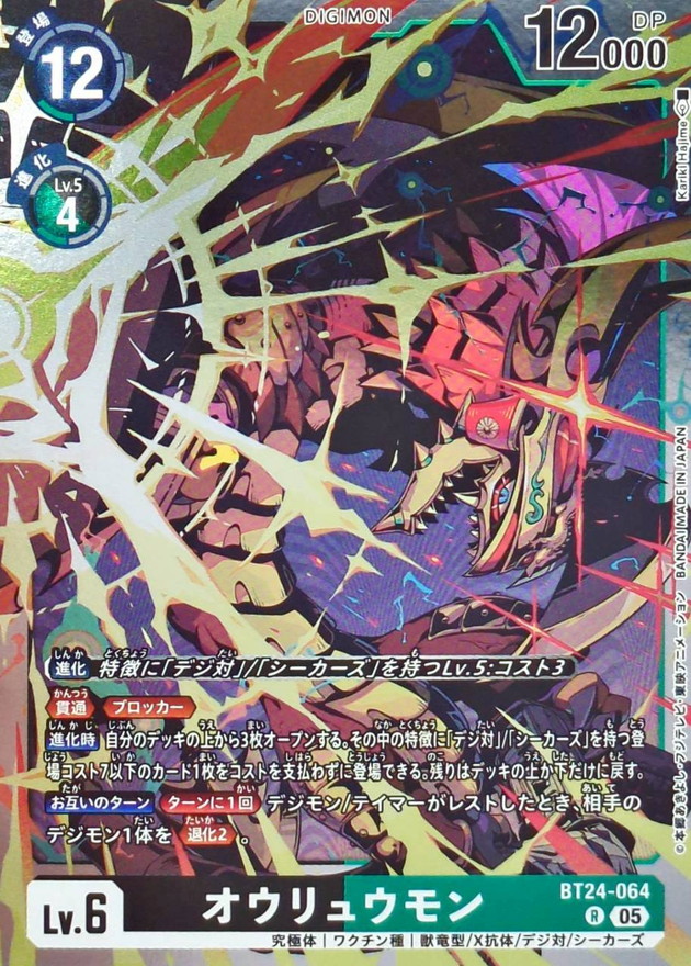 〔進化〕特徴に「デジ対」/「シーカーズ」を持つLv.5:コスト3≪貫通≫≪ブロッカー≫【進化時】自分のデッキの上から3枚オープンする。その中の特徴に「デジ対」/「シーカーズ」を持つ登場コスト7以下のカード1枚をコストを支払わずに登場できる。残りはデッキの上か下だけに戻す。【お互いのターン】[ターンに1回]デジモン/テイマーがレストしたとき、相手のデジモン1体を≪退化2≫。