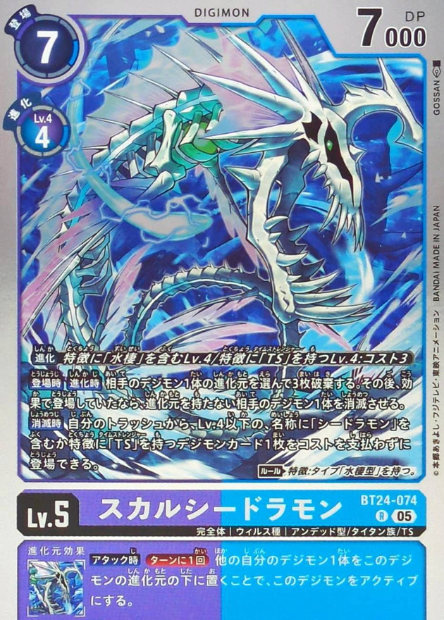 〔進化〕特徴に「水棲」を含むLv.4/特徴に「TS」を持つLv.4:コスト3【登場時】【進化時】相手のデジモン1体の進化元を選んで3枚破棄する。その後、効果で登場していたなら、進化元を持たない相手のデジモン1体を消滅させる。【消滅時】自分のトラッシュから、Lv.4以下の、名称に「シードラモン」を含むか特徴に「TS」を持つデジモンカード1枚をコストを支払わずに登場できる。〈ルール〉特徴:タイプ「水棲型」を持つ。【アタック時】[ターンに1回]他の自分のデジモン1体をこのデジモンの進化元の下に置くことで、このデジモンをアクティブにする。