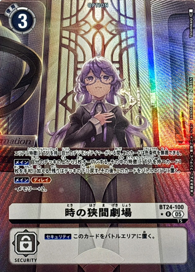エリアに特徴に「TS」を持つ自分のデジモン/テイマーがいる間、このカードは色条件を無視できる。【メイン】自分のデッキの上から3枚オープンする。その中の特徴に「TS」を持つカード1枚を手札に加える。残りはデッキの下に戻す。その後、このカードをバトルエリアに置く。【メイン】≪ディレイ≫・メモリー+2。【セキュリティ】このカードをバトルエリアに置く。