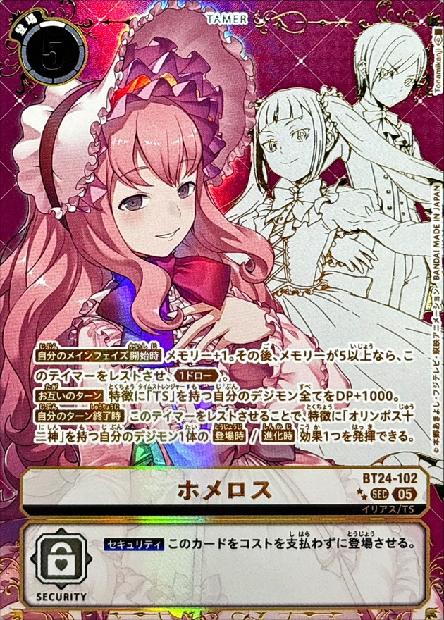 【自分のメインフェイズ開始時】メモリー+1。その後、メモリーが5以上なら、このテイマーをレストさせ、≪1ドロー≫。【お互いのターン】特徴に「TS」を持つ自分のデジモン全てをDP+1000。【自分のターン終了時】このテイマーをレストさせることで、特徴に「オリンポス十二神」を持つ自分のデジモン1体の【登場時】/【進化時】効果1つを発揮できる。【セキュリティ】このカードをコストを支払わずに登場させる。