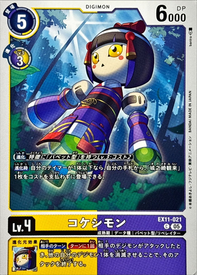 〔進化〕特徴に「パペット型」を持つLv.3:コスト2【進化時】自分のテイマーが1体以下なら、自分の手札から、「城之崎観来」1枚をコストを支払わずに登場できる。【相手のターン】[ターンに1回]相手のデジモンがアタックしたとき、他の自分のデジモン1体を消滅させることで、そのアタックを終了する。