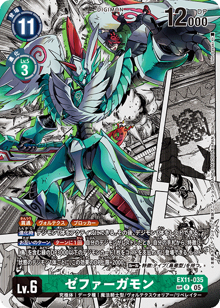 ≪貫通≫≪ヴォルテクス≫≪ブロッカー≫【進化時】デジモン1体をアクティブにできる。その後、デジモン1体をレストできる。【お互いのターン】[ターンに1回]自分のデジモンがレストしたとき、自分の手札から、特徴に「鳥」を含む緑のDP3000以下のデジモンカード1枚をコストを支払わずに登場できる。レスト状態のデジモン1体ごとに、この効果のDP上限+2000。〈ルール〉特徴:タイプ「鳥竜型」を持つ。