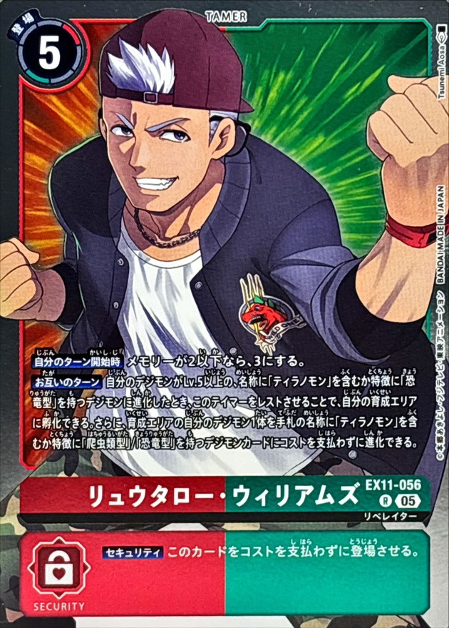 【自分のターン開始時】メモリーが2以下なら、3にする。【お互いのターン】自分のデジモンがLv.5以上の、名称に「ティラノモン」を含むか特徴に「恐竜型」を持つデジモンに進化したとき、このテイマーをレストさせることで、自分の育成エリアに孵化できる。さらに、育成エリアの自分のデジモン1体を手札の名称に「ティラノモン」を含むか特徴に「爬虫類型」/「恐竜型」を持つデジモンカードにコストを支払わずに進化できる。【セキュリティ】このカードをコストを支払わずに登場させる。