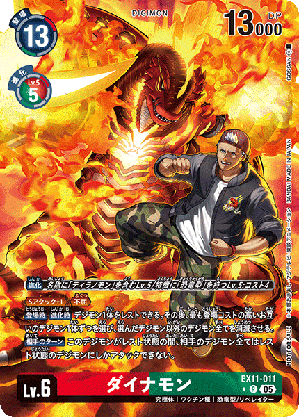 〔進化〕名称に「ティラノモン」を含むLv.5/特徴に「恐竜型」を持つLv.5:コスト4≪Sアタック+1≫≪不屈≫【登場時】【進化時】デジモン1体をレストできる。その後、最も登場コストの高いお互いのデジモン1体ずつを選び、選んだデジモン以外のデジモン全てを消滅させる。【相手のターン】このデジモンがレスト状態の間、相手のデジモン全てはレスト状態のデジモンにしかアタックできない。