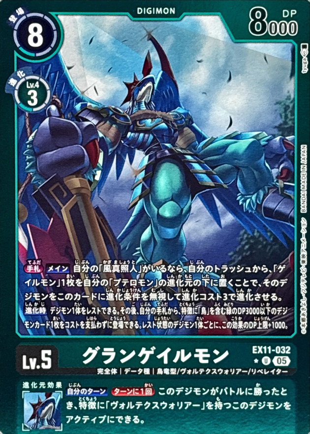 {手札}【メイン】自分の「風真照人」がいるなら、自分のトラッシュから、「ゲイルモン」1枚を自分の「プテロモン」の進化元の下に置くことで、そのデジモンをこのカードに進化条件を無視して進化コスト3で進化させる。【進化時】デジモン1体をレストできる。その後、自分の手札から、特徴に「鳥」を含む緑のDP3000以下のデジモンカード1枚をコストを支払わずに登場できる。レスト状態のデジモン1体ごとに、この効果のDP上限+1000。【自分のターン】[ターンに1回]このデジモンがバトルに勝ったとき、特徴に「ヴォルテクスウォリアー」を持つこのデジモンをアクティブにできる。