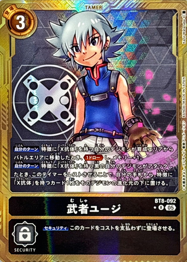 【自分のターン】特徴に「X抗体」を持つ自分のデジモンが育成エリアからバトルエリアに移動したとき、≪1ドロー≫し、メモリー+1。【自分のターン】特徴に「X抗体」を持つ黒の自分のデジモンがアタックしたとき、このテイマーをレストさせることで、自分の手札から、特徴に「X抗体」を持つカード1枚をそのデジモンの進化元の下に置ける。【セキュリティ】このカードをコストを支払わずに登場させる。