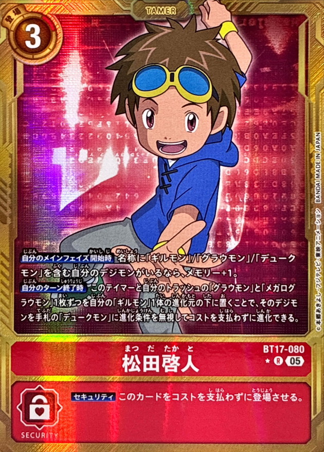 【自分のメインフェイズ開始時】名称に「ギルモン」/「グラウモン」/「デュークモン」を含む自分のデジモンがいるなら、メモリー+1。【自分のターン終了時】このテイマーと自分のトラッシュの「グラウモン」と「メガログラウモン」1枚ずつを自分の「ギルモン」1体の進化元の下に置くことで、そのデジモンを手札の「デュークモン」に進化条件を無視してコストを支払わずに進化できる。【セキュリティ】このカードをコストを支払わずに登場させる。