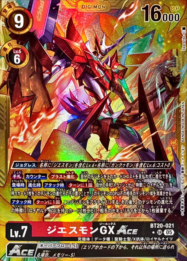 〔ジョグレス〕名称に「ジエスモン」を含むLv.6+名称に「ガンクゥモン」を含むLv.6:コスト0{手札}【カウンター】≪ブラスト進化≫(自分のデジモンをこのカードにコストを支払わずに進化できる)【登場時】【進化時】【アタック時】[ターンに1回]自分の手札/トラッシュから、特徴に「ロイヤルナイツ」を持つカード1枚をこのデジモンの進化元の下に置くことで、このデジモンのDP以下の相手のデジモン1体を消滅させる。【アタック時】[ターンに1回]このデジモンをアクティブにする。その後、このデジモンの進化元の特徴に「ロイヤルナイツ」を持つカード2枚ごとに、相手のセキュリティを上から1枚破棄する。≪オーバーフロー《-5》≫(エリアかカードの下から、それ以外の場所に送られる場合、メモリー-5)