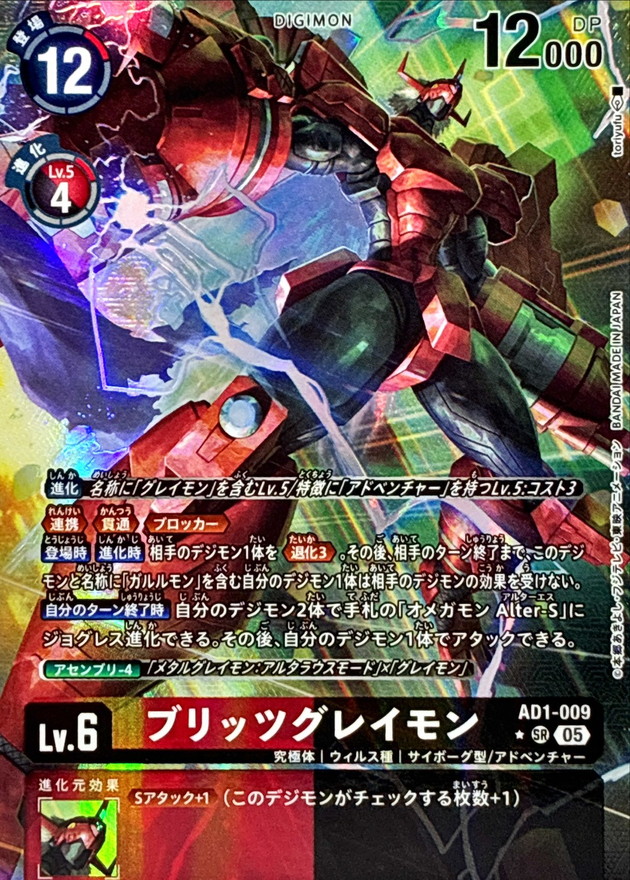 〔進化〕名称に「グレイモン」を含むLv.5/特徴に「アドベンチャー」を持つLv.5:コスト3≪連携≫≪貫通≫≪ブロッカー≫【登場時】【進化時】相手のデジモン1体を≪退化3≫。その後、相手のターン終了まで、このデジモンと名称に「ガルルモン」を含む自分のデジモン1体は相手のデジモンの効果を受けない。【自分のターン終了時】自分のデジモン2体で手札の「オメガモンAlter-S」にジョグレス進化できる。その後、自分のデジモン1体でアタックできる。アセンブリ-4:「メタルグレイモン:アルタラウスモード」×「グレイモン」≪Sアタック+1≫(このデジモンがチェックする枚数+1)