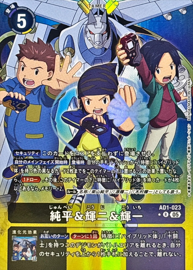 【セキュリティ】このカードをコストを支払わずに登場させる。【自分のメインフェイズ開始時】【登場時】自分の手札/トラッシュから、特徴に「ハイブリッド体」を持つ色の異なるカード2枚までをこのテイマーの下に置ける。この効果で置いたなら、≪1ドロー≫。その後、このテイマーの下に特徴に「ハイブリッド体」を持つカードが4枚以上あるなら、メモリー+2。〈ルール〉名称:「柴山純平」/「源輝二」/「木村輝一」としても扱う。【お互いのターン】[ターンに1回]特徴に「ハイブリッド体」/「十闘士」を持つこのデジモンがバトルエリアを離れるとき、自分のセキュリティを上から1枚手札に加えることで、離れない。