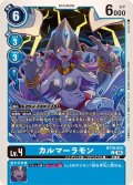 上段テキスト 「カルマーラモン」:コスト0【登場時】【進化時】自分のデッキの上から3枚オープンする。その中の特徴に「水棲」を含むデジモンカード1枚を手札に加えるか、青の自分のデジモンの…