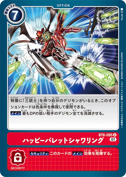 特徴に「三銃士」を持つ自分のデジモンがいるとき、このオプションカードは色条件を無視して使用できる。【メイン】最もDPの低い相手のデジモン全てを消滅させる。