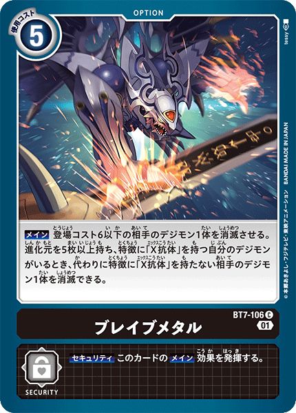 【メイン】登場コスト6以下の相手のデジモン1体を消滅させる。進化元を5枚以上持ち、特徴に「X抗体」を持つ自分のデジモンがいるとき、代わりに特徴に「X抗体」を持たない相手のデジモン1体を消滅できる。