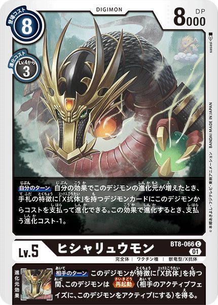 【自分のターン】自分の効果でこのデジモンの進化元が増えたとき、手札の特徴に「X抗体」を持つデジモンカードにこのデジモンからコストを支払って進化できる。この効果で進化するとき、支払う進化コスト-1。