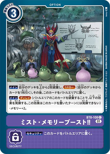 【メイン】自分のデッキを上から2枚破棄し、≪1ドロー≫(自分のデッキからカードを1枚引く)。その後、このカードをバトルエリアに置く。【メイン】≪ディレイ≫(バトルエリアのこのカードを破棄することで、以下の効果を発揮する。この効果はこのカードを置いたターンには発揮できない)・メモリー+2。