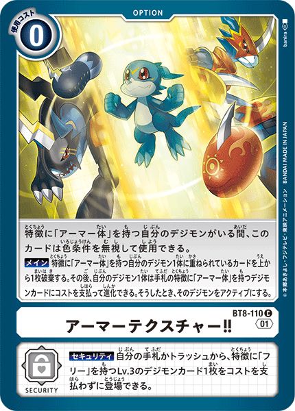 特徴に「アーマー体」を持つ自分のデジモンがいる間、このカードは色条件を無視して使用できる。【メイン】特徴に「アーマー体」を持つ自分のデジモン1体に重ねられているカードを上から1枚破棄する。その後、自分のデジモン1体は手札の特徴に「アーマー体」を持つデジモンカードにコストを支払って進化できる。そうしたとき、そのデジモンをアクティブにする。
