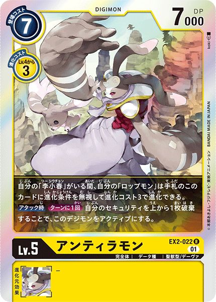 自分の「李小春」がいる間、自分の「ロップモン」は手札のこのカードに進化条件を無視して進化コスト3で進化できる。【アタック時】[ターンに1回]自分のセキュリティを上から1枚破棄することで、このデジモンをアクティブにする。