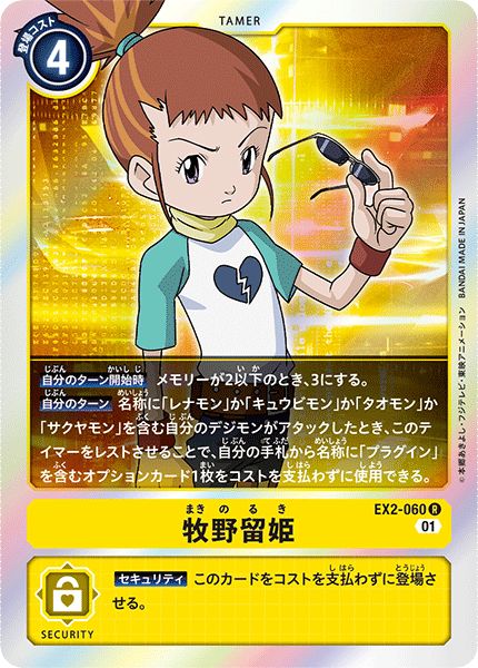 【自分のターン開始時】メモリーが2以下のとき、3にする。【自分のターン】名称に「レナモン」か「キュウビモン」か「タオモン」か「サクヤモン」を含む自分のデジモンがアタックしたとき、このテイマーをレストさせることで、自分の手札から名称に「プラグイン」を含むオプションカード1枚をコストを支払わずに使用できる。